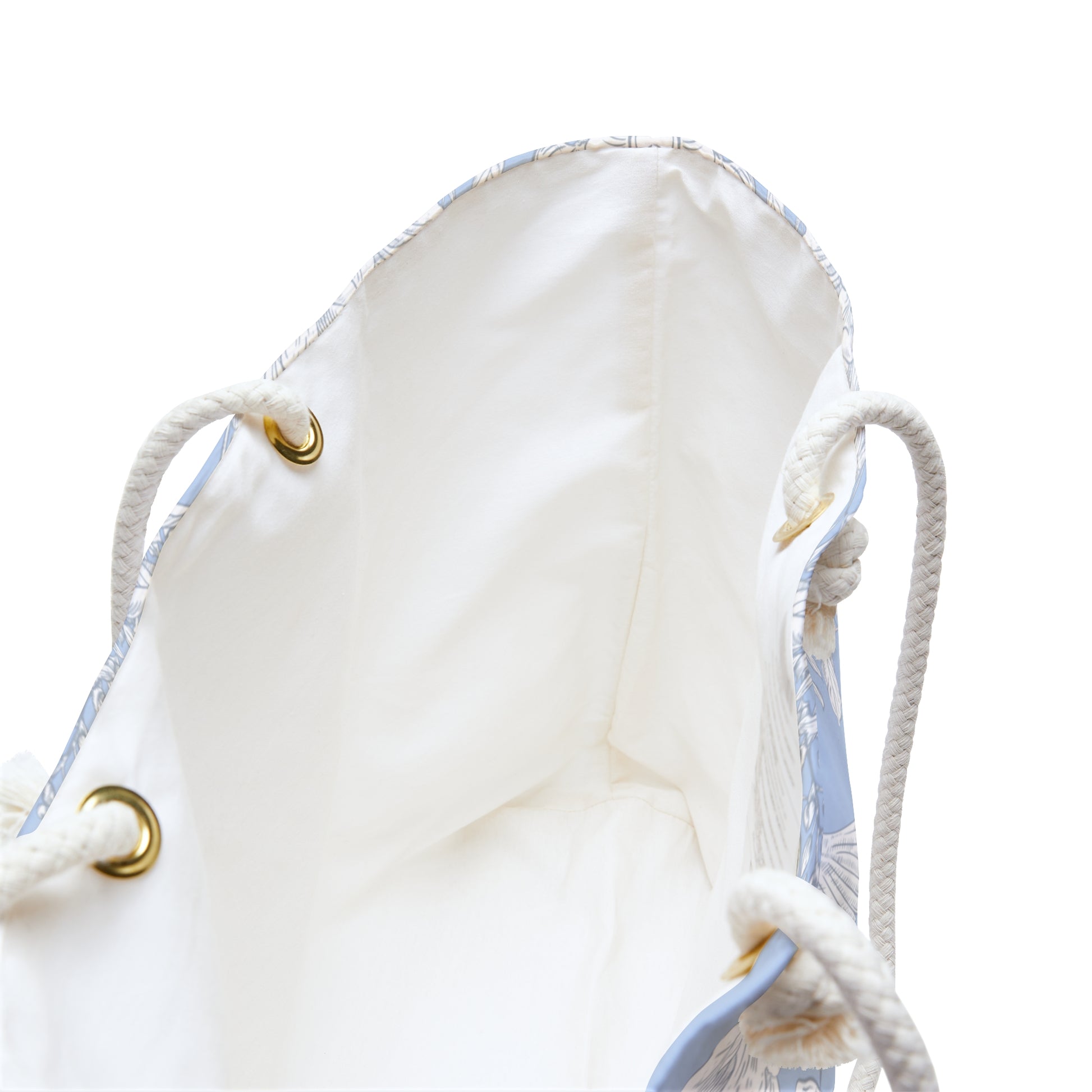 Crafted from 100% spun polyester, it resists wrinkles and holds its shape — no ironing needed. The wide opening makes it easy to pack diapers, bottles, snacks, toys, and more. Soft cotton rope handles (27" long) looped through gold-tone grommets add comfort and subtle elegance for every outing.